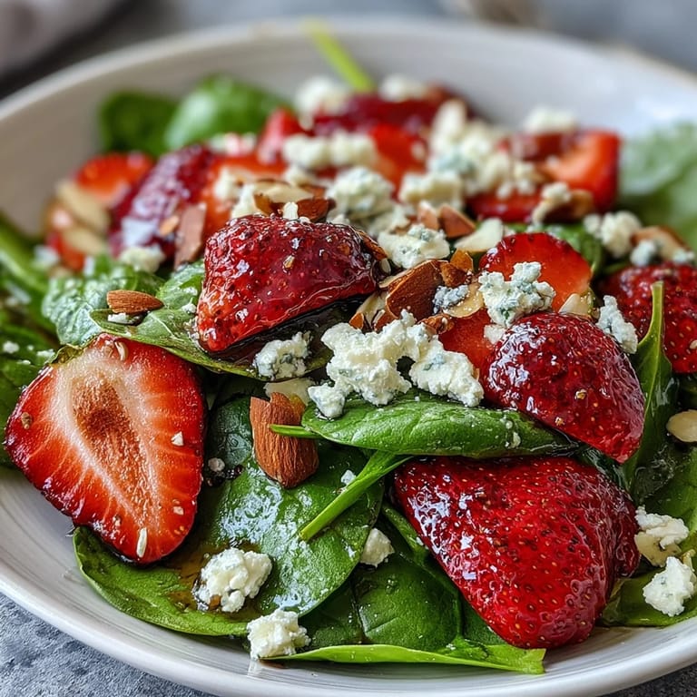 Save Experience the essence of summer with this vibrant Fresh Strawberry Spinach Salad. This dish combines the natural sweetness of sun-ripened strawberries with tender baby spinach and the salty tang of crumbled feta cheese. The addition of golden toasted almonds provides a satisfying crunch that makes every bite perfectly balanced and refreshing.