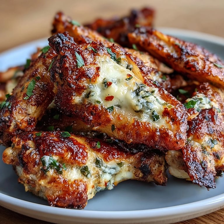 Save There's something about the sizzle of wings hitting a hot oven that makes a quiet Tuesday night feel like game day, even when you're just cooking for yourself. I stumbled onto this garlic parmesan combination while experimenting with keto-friendly finger foods, and what started as a simple dinner became the thing I make whenever someone says they're hungry but doesn't want the carb commitment. The butter pools with minced garlic, the cheese crisps at the edges, and suddenly you're standing in your kitchen wondering why you didn't discover this sooner.
