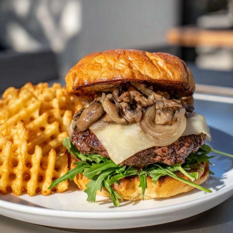 Save A savory, juicy beef burger topped with sautéed mushrooms and melted Swiss cheese, served alongside crisp, golden waffle fries—perfect for a satisfying meal.