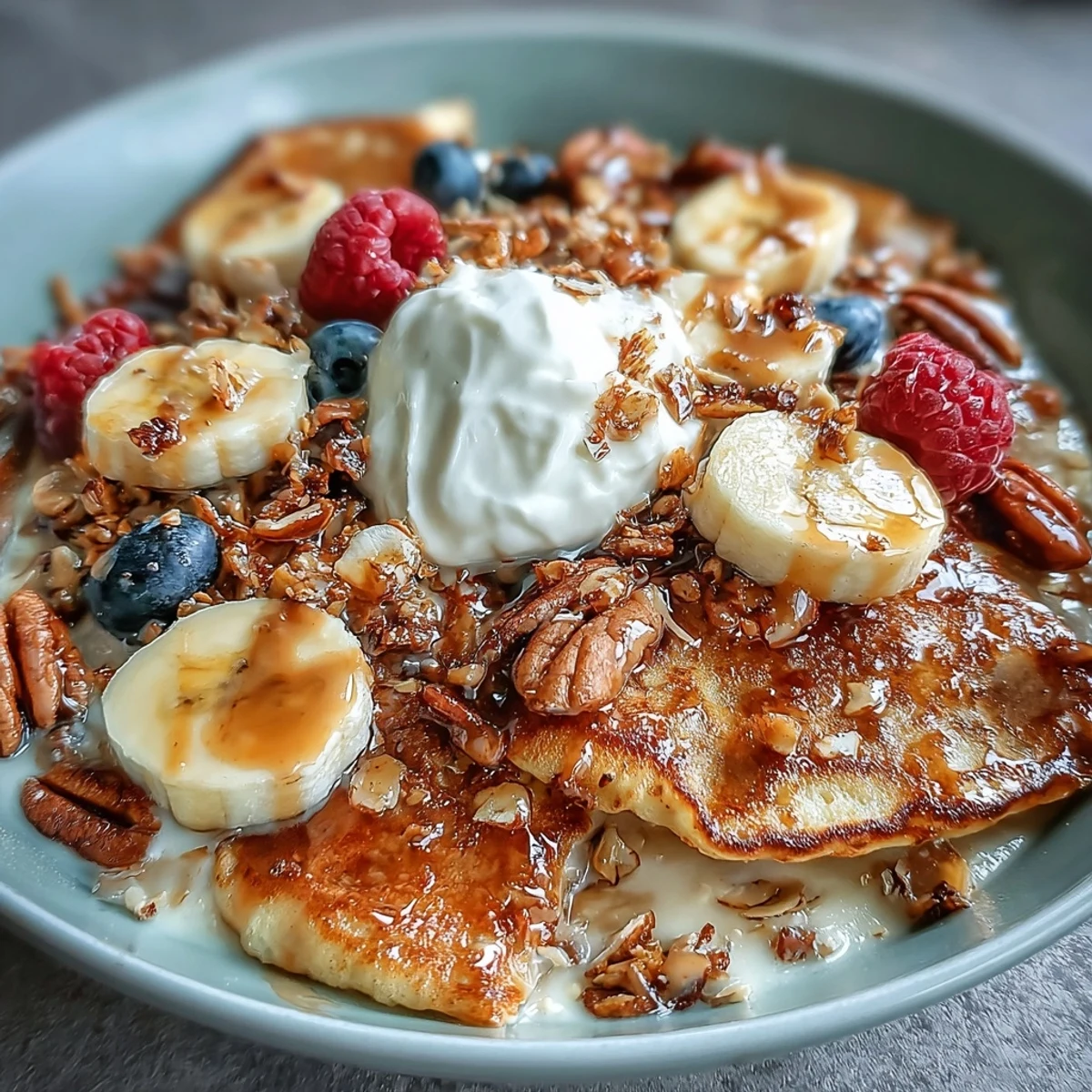 - Transfer pancake(s) to a wide bowl. Cut into bite-size pieces if desired. Top with Greek yogurt or skyr, swirling in honey or maple syrup if you like. Arrange banana slices and berries over the top. Sprinkle with nuts/seeds and granola. Drizzle with nut butter and finish with extra honey, maple syrup, cinnamon, or cocoa nibs.