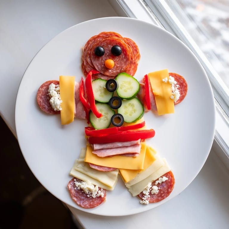 Save A playful and festive appetizer platter featuring a savory gingerbread man made with meats, cheeses, and vibrant vegetables—perfect for holiday gatherings.