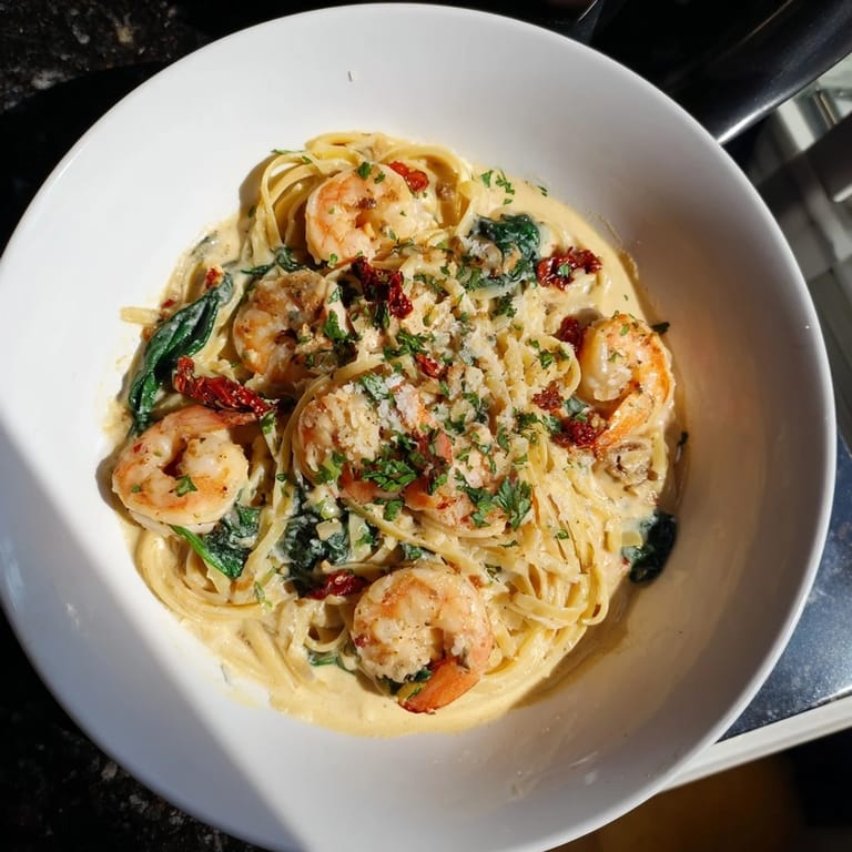 Save A creamy, flavorful pasta dish featuring succulent shrimp, sun-dried tomatoes, spinach, and a garlicky Parmesan sauce. Perfect for a cozy Italian-inspired dinner.