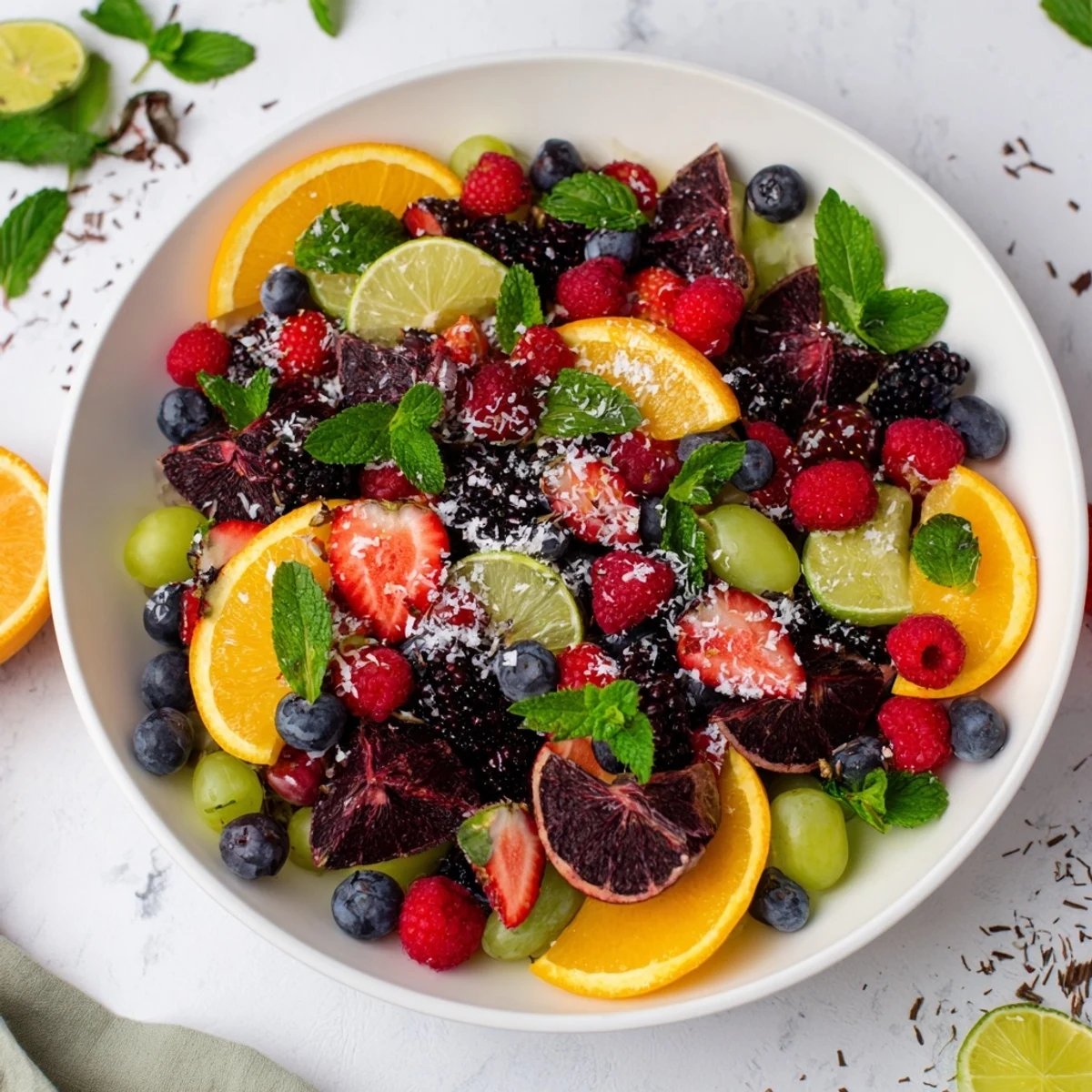 Fresh berries like raspberries, blackberries, and strawberries, along with citrus slices and grapes, add vibrant color and flavor.