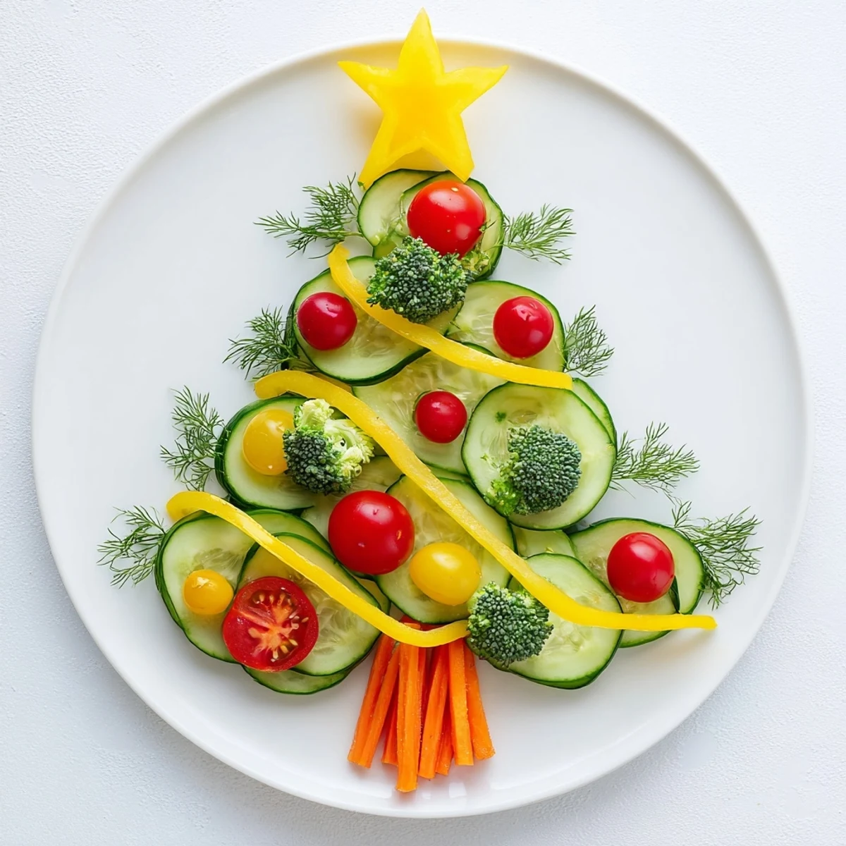 Take care to slice the cucumbers evenly so the tree shape holds well and looks neat. Using a small cookie cutter can make forming the bell pepper star easier and more uniform. Assemble the platter just before serving to keep the vegetables fresh and crisp.
