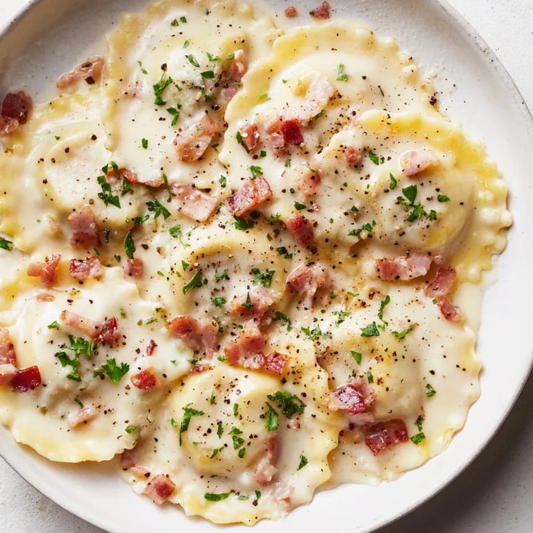 Cheese ravioli in creamy carbonara sauce with pancetta, Parmesan, and parsley for a savory Italian-inspired meal.