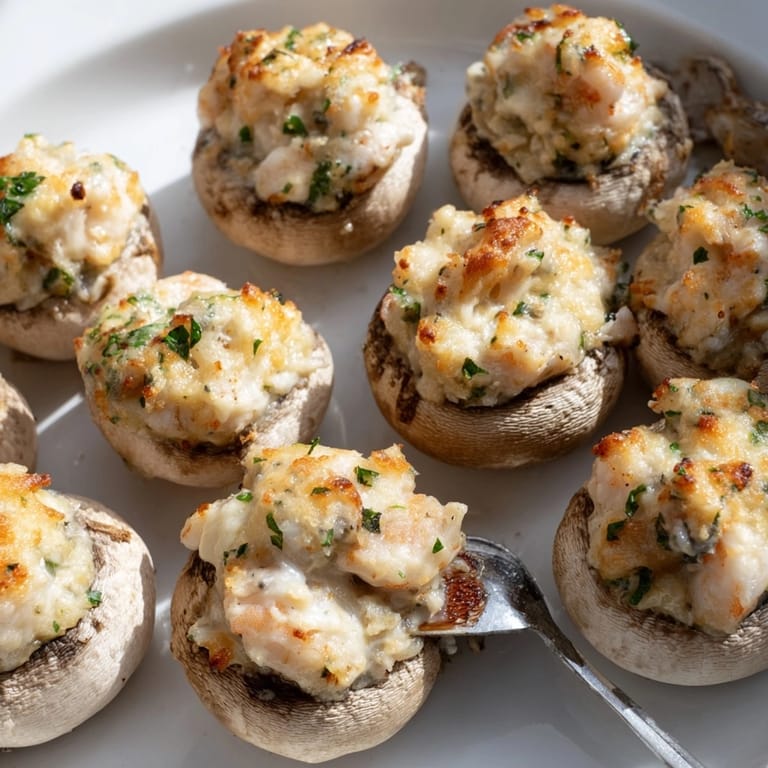 Jumbo mushrooms are filled with a luscious blend of sautéed shrimp, garlic, cream, Parmesan, and herbs for irresistible flavor. Each cap is topped with mozzarella and baked until golden, making for an elegant bite-sized appetizer or a delightful light meal. The balance of creamy filling, tender shrimp, and juicy mushrooms delivers robust taste in every bite—ideal for entertaining or enjoying as a special treat at home. Serve warm, garnished with parsley and accompanied by a crisp green salad or a glass of chilled white wine.